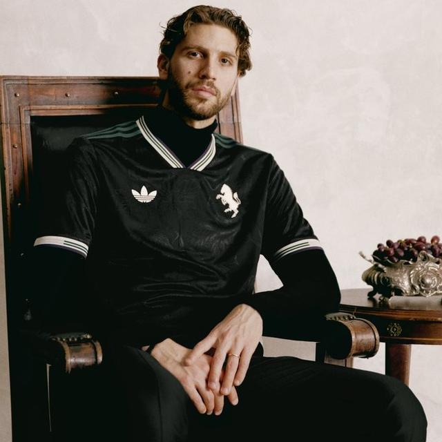 整套球衣以黑色短裤收尾,队徽、三叶草与球员号码点缀米白色细节,搭配深绿色三条纹。黑色球袜印有“Juventus”字样,完整呈现整体造型。